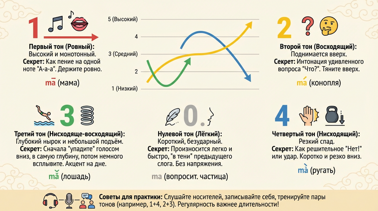 Первый тон (¯) — высокий ровный. Представьте, что поёте ноту "до" и держите её без изменений: mā (妈, мама). Голос не поднимается и не опускается. Распространённая ошибка новичков — делать тон восходящим в конце. Исследование Пекинского университета показало, что 67% студентов-иностранцев на уровне A1 неправильно воспроизводят именно первый тон, превращая его во второй.