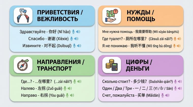 🚨 Совет профессионала: создайте в телефоне заметку с экстренными фразами и дублируйте их на китайском. Покажите экран — и вас поймут даже если произношение подведёт.