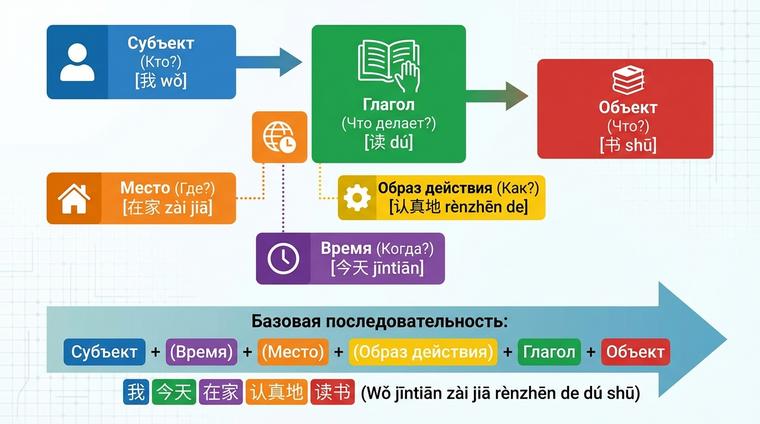 Китайский язык отличается от русского отсутствием привычных нам изменений глаголов по временам, родам и числам. Глагол остается неизменным — контекст и временные маркеры делают всю работу. Базовая структура предложения о действии выглядит так: Подлежащее + (Временной маркер) + Глагол + Дополнение. Это железное правило, нарушение которого сразу выдаст начинающего студента.