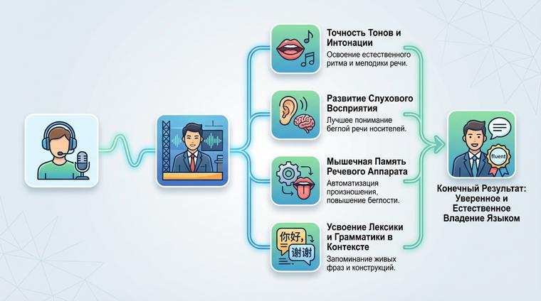 Когда вы синхронно повторяете за носителем китайского языка, происходит несколько процессов одновременно. Во-первых, ваш речевой аппарат запоминает моторные паттерны — язык, губы и гортань учатся двигаться правильно. Китайские звуки физически отличаются от русских: например, звук zh (как в 中国 zhōngguó) требует завитка языка назад, чего в русском нет. Без многократного повторения за носителем вы просто не сможете автоматизировать эти движения.