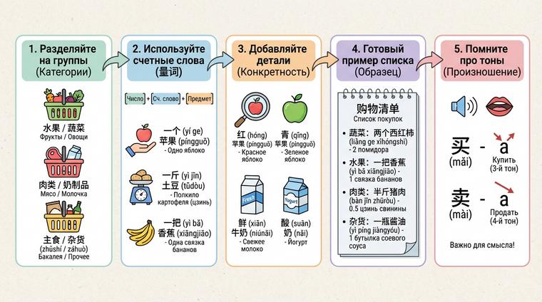 Четвёртый принцип — лаконичность и структурированность. Китайский список покупок выглядит компактно за счёт иероглифической письменности. Вместо длинного русского «куриная грудка без кожи» китаец напишет 鸡胸肉 (jī xiōng ròu) — всего три иероглифа. Рекомендуется располагать товары столбиком, по категориям, с указанием количества слева: