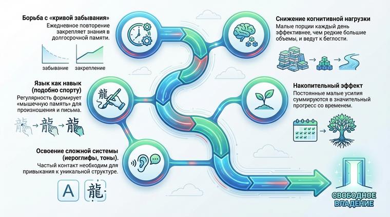 Китайский язык устроен принципиально иначе, чем европейские языки. Здесь нет алфавита, нет привычных грамматических конструкций, а тоновая система превращает каждое слово в акробатический номер для вашего речевого аппарата. И вот что нужно понимать: без ежедневной практики ваш мозг просто не успевает закрепить эти непривычные паттерны. Исследования показывают, что для формирования устойчивых нейронных связей требуется регулярное повторение — именно поэтому разовые интенсивы раз в неделю дают в разы меньший результат, чем короткие, но ежедневные сессии.