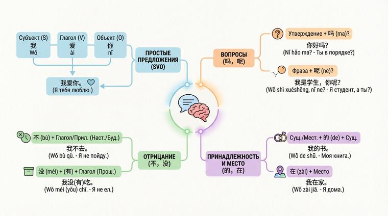 Китайская грамматика держится на четырёх столпах, которые покрывают 80% разговорных ситуаций. Первый — конструкция субъект + глагол + объект (我喝咖啡 wǒ hē kāfēi — я пью кофе). Второй — связка через 是 shì для идентификации (这是我的书 zhè shì wǒ de shū — это моя книга). Третий — прилагательное как сказуемое без глагола-связки (天气好 tiānqì hǎo — погода хорошая). Четвёртый — модальные глаголы перед основным действием (我想去 wǒ xiǎng qù — я хочу пойти).