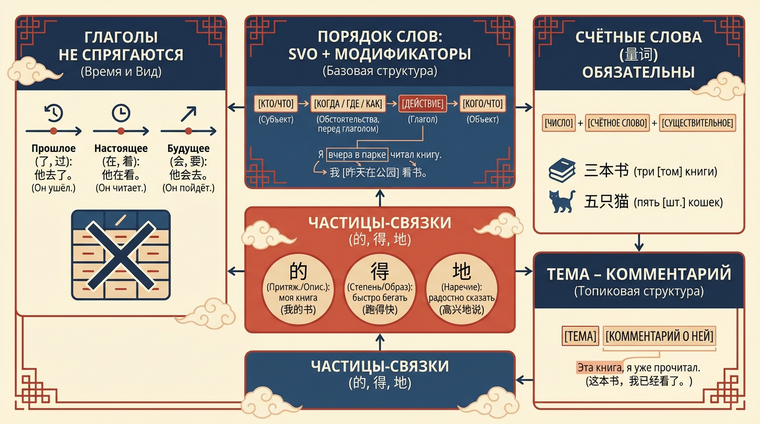 Китайская грамматика строится на нескольких железных правилах, которые нельзя нарушать. Первое и главное — жёсткий порядок слов. В отличие от русского, где падежи позволяют переставлять части предложения, китайский требует строгой последовательности: подлежащее — сказуемое — дополнение. Сдвиньте элемент — и фраза либо потеряет смысл, либо станет грамматически неверной.