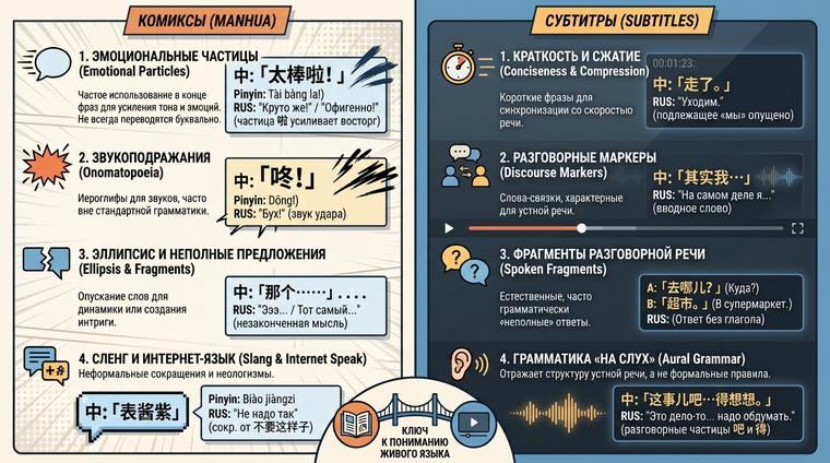 Китайские визуальные медиа — комиксы и субтитры — отражают разговорный язык, который существенно отличается от письменного стандарта. Здесь грамматика упрощается, конструкции сокращаются, а контекст становится главным проводником смысла. В отличие от академических текстов, где каждое предложение выстроено по строгим правилам, диалоги в маньхуа и субтитрах опираются на эллипсис — намеренное опущение частей предложения, которые понятны из ситуации. 📚