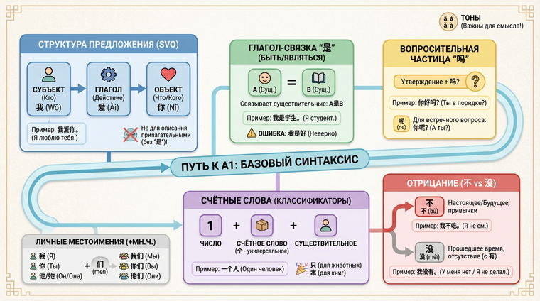 Китайский язык пугает многих своей письменностью и тональностями, но именно грамматика может стать вашим неожиданным союзником. Пока другие изучающие спотыкаются о падежи и спряжения в европейских языках, вы откроете для себя систему, где глаголы не меняются по лицам, а существительные не склоняются. Однако кажущаяся простота обманчива: за отсутствием привычных категорий скрывается стройная логика порядка слов, частиц и конструкций, которую нужно понять, чтобы не просто заучивать фразы, а думать по-китайски. Этот гид проведёт вас от первых шагов до уверенного владения языком, раскрывая секреты грамматической структуры на каждом уровне — от базовых предложений А1 до сложных паттернов В2. 📚