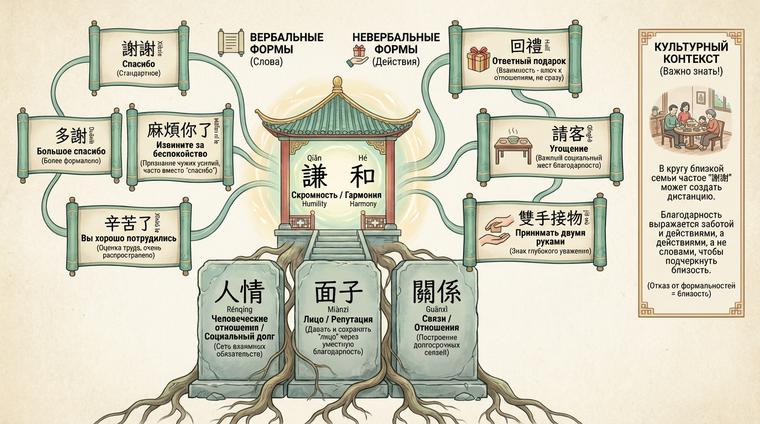 Попробуйте поблагодарить китайского коллегу словами «спасибо» — и увидите, как он слегка смутится или даже отмахнётся. Не потому, что вы сказали что-то не то, а потому, что в китайской культуре благодарность работает совсем не так, как мы привыкли. Здесь слова значат меньше, чем жесты, подарки или даже молчание в нужный момент. Китайцы веками оттачивали искусство выражения признательности через контекст, ритуалы и тонкую невербалику — и если вы не понимаете этих правил, рискуете прослыть невеждой или даже обидеть человека, которому хотели сделать приятное. Разберёмся, как работает благодарность по-китайски и почему простое «谢谢» (xièxie) — это лишь верхушка айсберга.