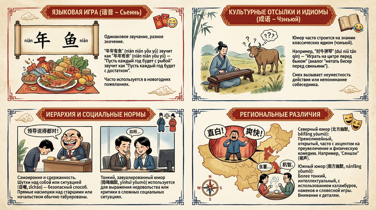 Китайский юмор укоренён в многотысячелетней культуре, где важны не только слова, но и подтекст, намёки, исторические аллюзии. В отличие от западного юмора, часто построенного на прямолинейной иронии или абсурде, китайские шутки требуют знания контекста — литературных классиков, философских концепций, общественных норм.