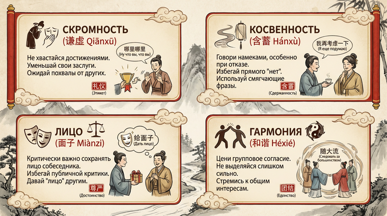 Китайская культура построена на концепции «лица» (面子, miànzi) — социального капитала, который можно заработать или потерять в зависимости от того, как вы себя ведёте. Рассказывая о себе, вы не просто делитесь биографией — вы демонстрируете, насколько хорошо понимаете правила игры. Центральный принцип здесь — скромность (谦虚, qiānxū), но не путайте её с самоуничижением западного образца. Китайская скромность — это стратегический инструмент, позволяющий сохранить своё лицо и не задеть чужое.