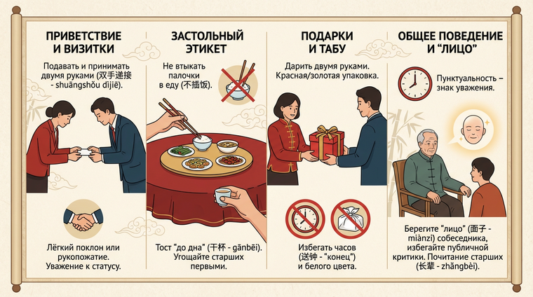 Приветствие и представление. В Китае принято здороваться лёгким поклоном головы или рукопожатием. Рукопожатие должно быть мягким, без излишнего напора — сильное сжатие руки воспринимается как агрессия. Если вы участвуете в официальном мероприятии, всегда дожидайтесь, пока старший по рангу или хозяин встречи протянет руку первым. Визитные карточки (名片, míngpiàn) вручаются и принимаются двумя руками, с лёгким поклоном. Получив карточку, внимательно изучите её, прежде чем убрать — это знак уважения к человеку и его статусу.