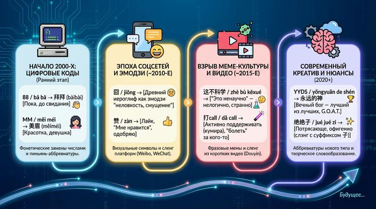 | 2020-е | Эмоджи, сокращения фраз, интеграция с видео | YYDS, 绝绝子, 栓Q, 文学 (стиль речи) |