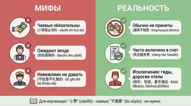Миф первый: "В Китае обязательно нужны чаевые в дорогих заведениях". Реальность: даже в пятизвёздочных отелях и ресторанах чаевые не входят в культурный код. Обслуживание включено в цену, и персонал получает достойную оплату от работодателя. Исключение составляют лишь заведения, ориентированные на западных туристов, где могут добавить service charge в размере 10-15% к счёту — но это официальная наценка, а не чаевые в классическом понимании.