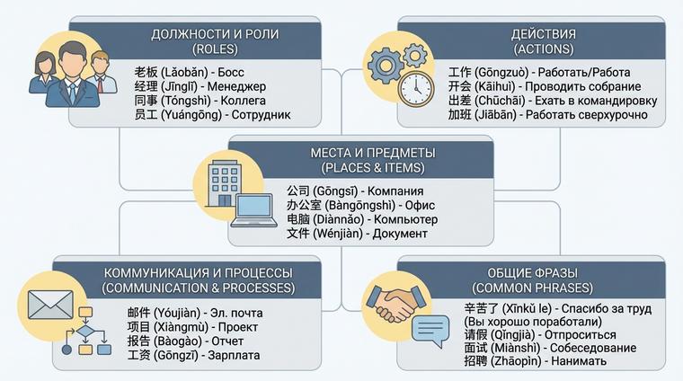 Корпоративная культура в Китае требует знания терминов, связанных с иерархией. 上司 (shàngsī) — начальник, 同事 (tóngshì) — коллега, 下属 (xiàshǔ) — подчинённый. Обращение к вышестоящим требует добавления фамилии и должности: 王经理 (Wáng jīnglǐ) — "менеджер Ван".