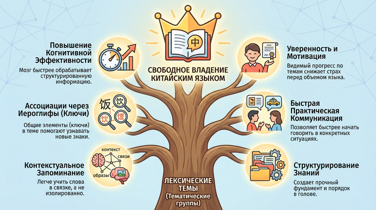 Китайский язык пугает многих своими тысячами иероглифов и тональностями, но профессионалы знают секрет: запоминать слова не хаотично, а системно — это как построить здание с фундаментом вместо того, чтобы складывать кирпичи в беспорядочную кучу. Лексические темы — это не модная методика из учебников, а проверенный инструмент, который превращает хаос китайской лексики в управляемую структуру. Если вы до сих пор учите слова списками из приложений, вырванные из контекста, то теряете до 60% эффективности своих усилий. Пора перестать работать больше и начать работать умнее — тематическая группировка словарного запаса даёт результаты в разы быстрее, и у меня есть чем это подтвердить.