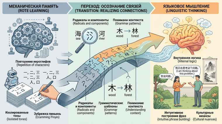 Заучивание слов по спискам — это тупиковая ветвь эволюции в изучении языка. Вы можете знать перевод 3000 иероглифов, но не суметь выразить простейшую мысль, потому что мозг хранит эти знания в формате "иероглиф = русское слово", без привязки к грамматике, контексту и реальному употреблению. Языковое мышление работает иначе: вы не переводите с русского на китайский и обратно — вы сразу думаете китайскими конструкциями и автоматически извлекаете нужную лексику.
