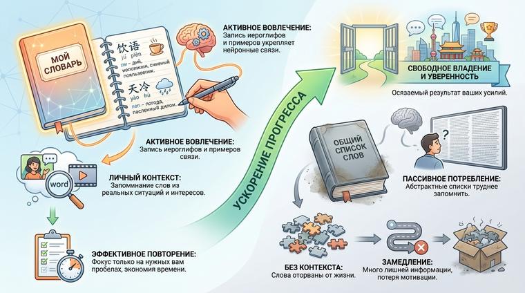 📊 Практическая статистика показывает: студенты, ведущие личные словари, запоминают новые иероглифы на 2-3 недели быстрее тех, кто просто работает с готовыми списками. Причина проста: вы не тратите время на заучивание слов, которые никогда не пригодятся. Вместо этого фокусируетесь на активной лексике — той, что действительно используете.