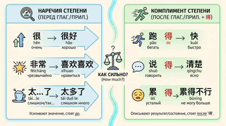 В китайском языке нет морфологических изменений, как в русском («красивый — красивее — самый красивый»). Степень выражается через добавление служебных слов и наречий. Это делает систему предсказуемой: вы берёте базовое прилагательное и добавляете модификатор. Никаких исключений, никаких чередований. Чистая логика.