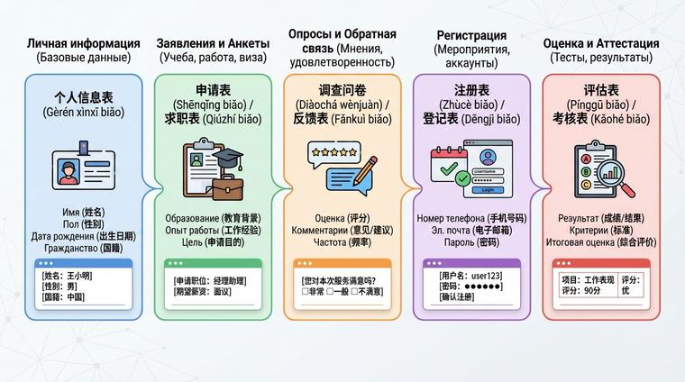 Владение специфической терминологией — основа корректного заполнения форм. Начнём с личных данных (个人信息 — gèrén xìnxī), которые встречаются практически в каждом бланке.