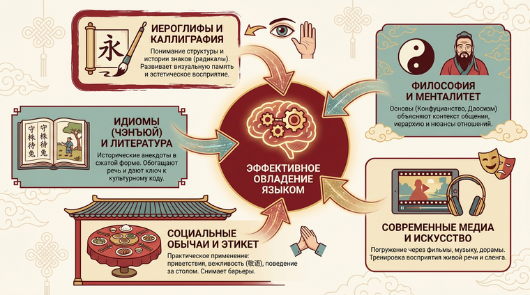 Китайская кухня, чайная церемония, каллиграфия — всё это не просто "культурная программа", а полноценные языковые инструменты. Названия блюд содержат идиомы и исторические аллюзии (например, 宫保鸡丁, gōngbǎo jīdīng, "курица кунгпао" — отсылка к чиновнику эпохи Цин). Термины чайного искусства формируют целый пласт метафорической лексики. Каллиграфия учит структуре иероглифов и последовательности черт.