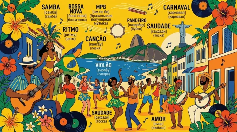 Музыка — это душа бразильского карнавала, и владение связанной с ней лексикой является ключом к пониманию культуры праздника. 🎵 Рассмотрим основную терминологию, связанную с музыкальным сопровождением карнавала.
