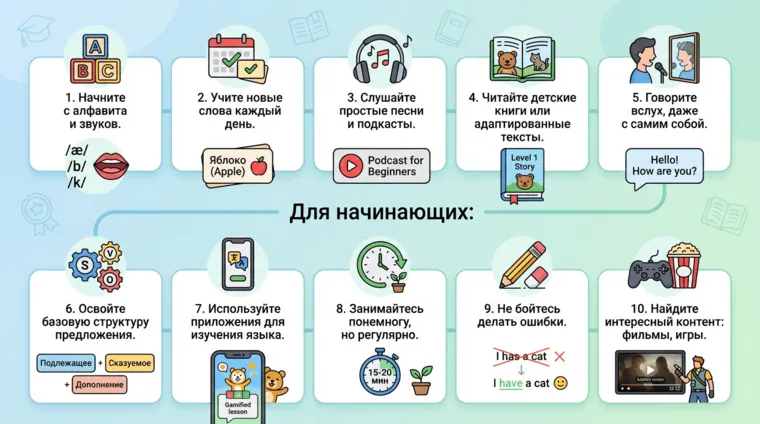 Чтобы заговорить на английском даже на начальном уровне, изучите самые популярные слова и выражения, которых будет достаточно для повседневного общения. Как правило, это те существительные, прилагательные, местоимения и глаголы, без которых не обойтись при разговоре. Придумывайте раз за разом предложения с ними и освойте нужные грамматические конструкции, чтобы грамотно их использовать. После этого вы сможете быстро заводить разговоры на самые базовые темы.