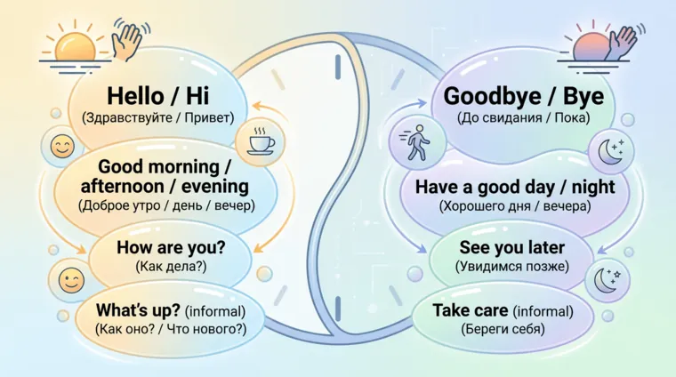 Конечно, всегда можно обойтись словами “Hello”, “How are you?” и “Goodbye”, но существуют и более разнообразные способы поздороваться и попрощаться, особенно в дружеской обстановке (например, в группе на курсах английского языка):