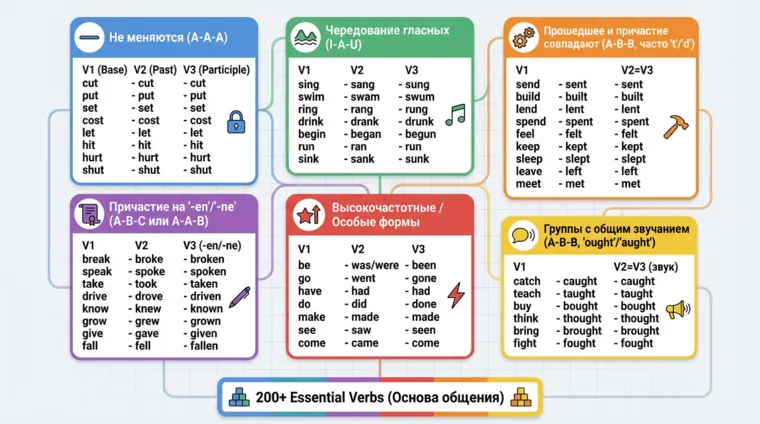 Начиная учить irregular verbs, не забывайте о различных группах, которые помогут легче запомнить все три формы. Обращайте внимание на перевод — иногда от значения зависит, правильный этот глагол или нет.