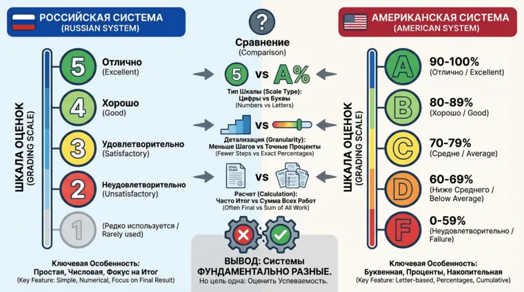В США оценки обозначаются не цифрами, а буквами, и их действительно пять: А (отлично), В (хорошо), С (удовлетворительно), D (слабо) и F (неудовлетворительно). А соответствует нашей «5», B – «4», С и D – это «3», обе они являются проходным баллом, а вот F – это «2».