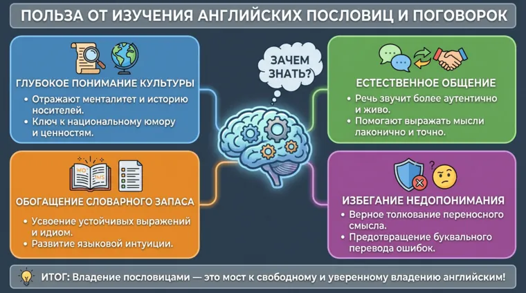 - Пословицы и поговорки помогают лучше понять культуру и ценности англоязычных стран.