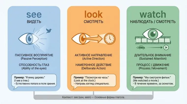 Отличия между глаголами see, look и watch