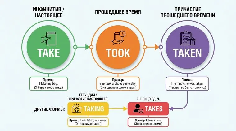 Глагол to take имеет следующие формы: основная форма (take), прошедшее время (took) и причастие прошедшего времени (taken).