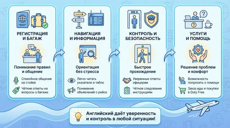 Английский — это международный язык, на котором говорят в любом аэропорту мира. Конечно, не все сотрудники говорят на нём в совершенстве. Но основные слова и фразы на английском, которые помогут ответить на вопросы пассажиров и наладить с ними диалог, они точно знают. И сегодня мы пройдём несколько экспресс-уроков, чтобы вы чувствовали себя спокойнее во время путешествия на самолёте.