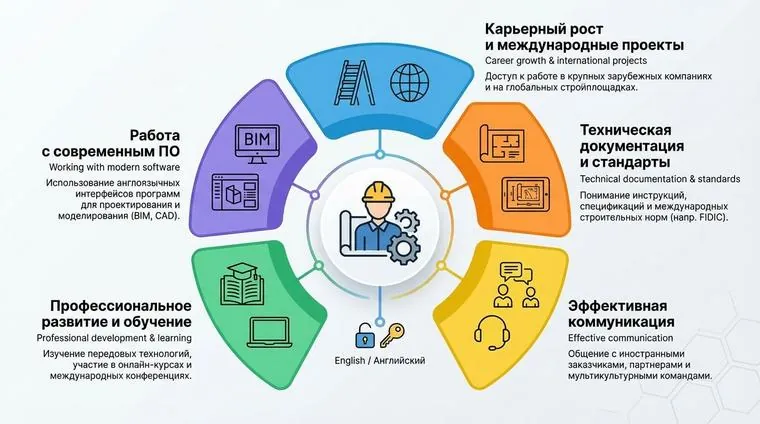 чтобы работать с зарубежными партнерами и клиентами: привлекать инвесторов, заключать договоры, обсуждать условия и технические задания, презентовать строительные проекты и т. д.;