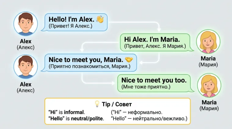 Person B: Hello, Anna! I'm Mark. Nice to meet you. (Привет, Анна! Я Марк. Приятно познакомиться.)