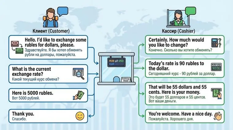 Teller: The exchange rate today is 1 USD = 0.85 EUR. (Курс обмена сегодня 1 доллар = 0.85 евро.)