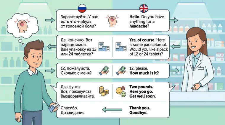 Customer: Hello, I need something for a headache. (Здравствуйте, мне нужно что-то от головной боли.)