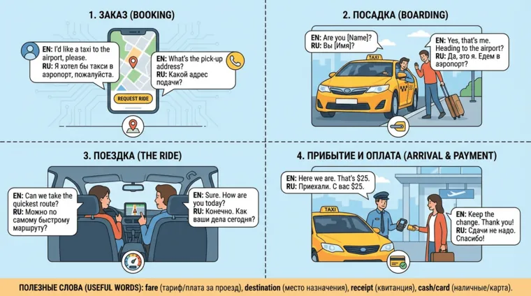 Passenger: Hi, I need a taxi to the airport. (Привет, мне нужно такси в аэропорт.)