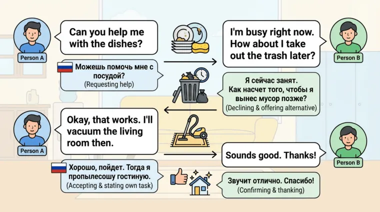 John: Could you do the dishes now? I'll vacuum the living room. (Можешь сейчас помыть? Я пропылесошу гостиную.)