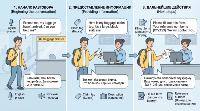 Passenger: Excuse me, my luggage hasn't arrived. (Извините, мой багаж не прибыл.)