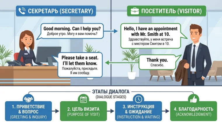 Visitor: Good morning! I have an appointment with Mr. Johnson at 10 AM. (Доброе утро! У меня назначена встреча с мистером Джонсоном на 10 утра.)