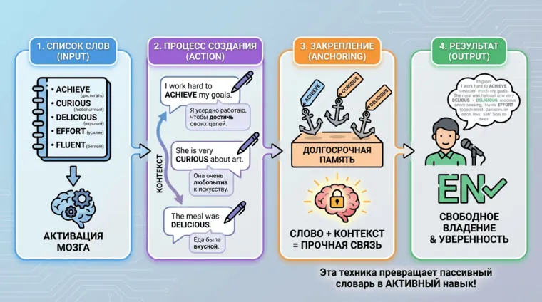 Просто прочитать и запомнить слово недостаточно, по крайней мере, в большинстве случаев. Но составляя с ним собственные предложения, вы сможете заметно продвинуться вперед. Попробуйте сами, и вы ощутите эффект.