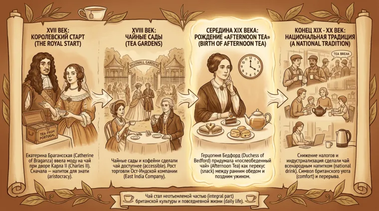 Английское чаепитие — самая известная из британских традиций. Однако чай был завезен в Англию сравнительно недавно, в середине XVII-го века. Популярность напитка росла довольно медленно, распространяясь из Азии в Европу в конце XVI – начале XVII веков, когда поставки чая голландскими и португальскими торговыми судами приобрели регулярный характер.