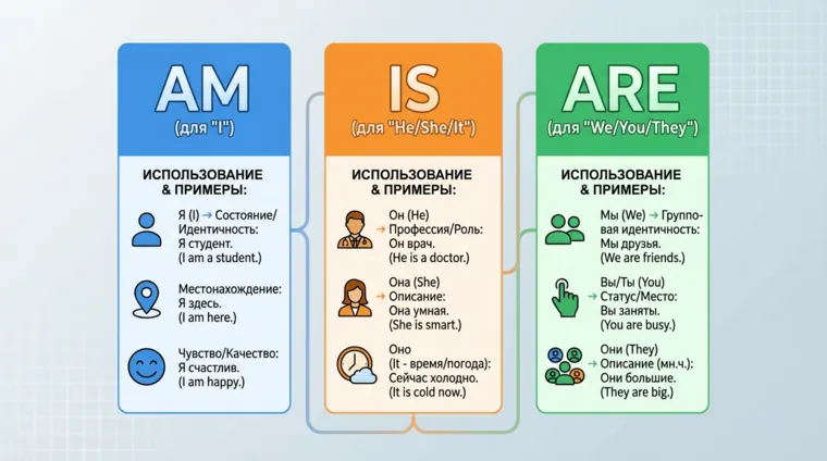 Глагол to be может быть частью грамматических конструкций. Рассмотрим основные.