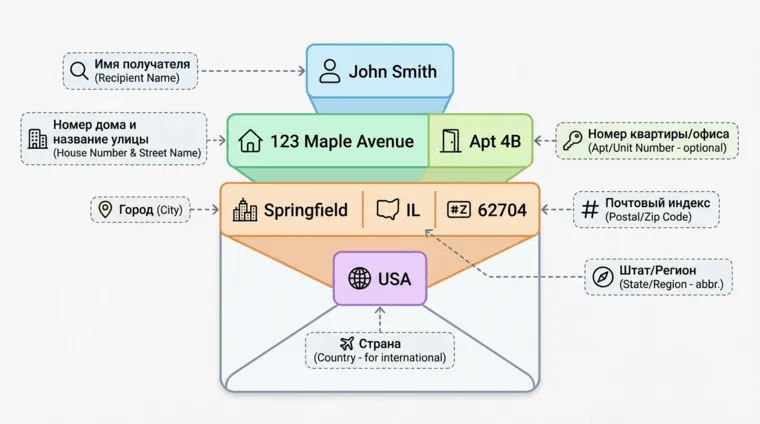 Название штата записывается двухбуквенным сокращением (например, NY – Нью-Йорк, CA – Калифорния). Полный список сокращений можно узнать на официальном сайте Почтовой службы США – usps.com.