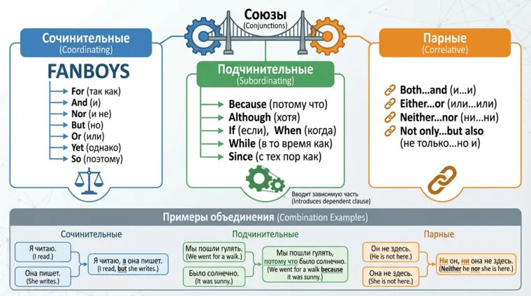 Давайте узнаем основные принципы, по которым следует объединять предложения в английском языке.