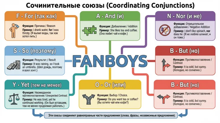 Вот основные сочинительные союзы в английском языке: for (чтобы, ибо), and (и), nor (ни), but (но), or (или), yet (но, хотя), so (так что, поэтому). Чтобы их запомнить, можно использовать слово-мнемоник fanboys (фанаты).