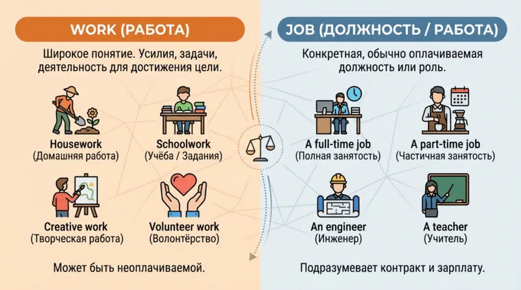 Оба слова, и work, и job, означают «работа», чем могут вызвать путаницу. Work — понятие более общее и означает деятельность в целом. Мы используем слово work и как неисчисляемое существительное, и как глагол. Например:
