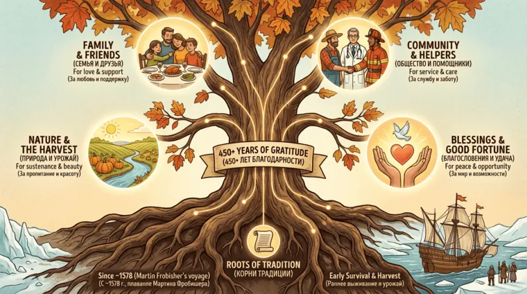 Несколько позже французские переселенцы, благополучно обустроившиеся немного южнее маршрутов Фробишера, ввели в обиход «Обычай хорошего настроения» («The custom of a good mood») — праздник, на который приглашались коренные жители Канады, и который посвящался всё тем же благодарственным молитвам.
