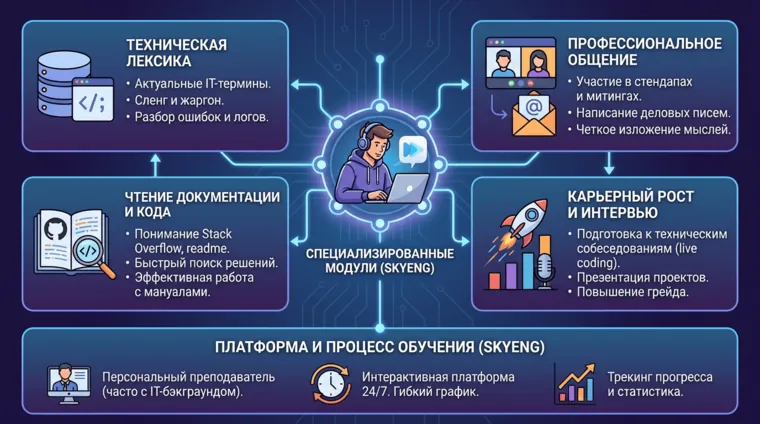 - Курс в первую очередь ориентирован на освоение специальной лексики, которая пригодится вам на собеседовании и в работе. Это не только термины по теме информационных технологий, но и слова, связанные с трудоустройством.