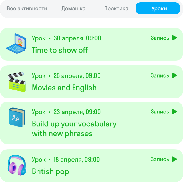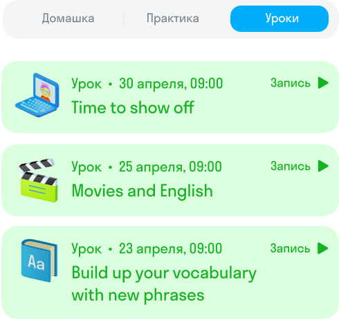 В личном кабинете вы найдёте запись урока и сможете сделать задания, которые группа выполняла во время занятия. Домашка после урока позволит закрепить знания.